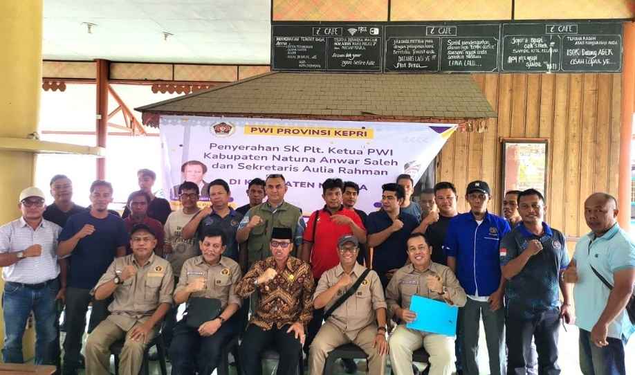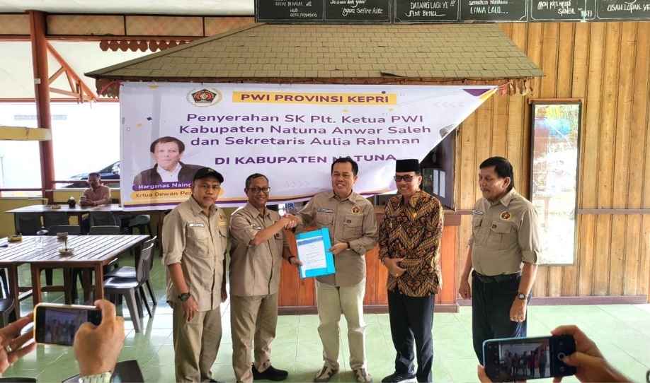 Natuna – Ketua Persatuan Wartawan Indonesia (PWI) Provinsi Kepulauan Riau (Kepri) Saibansah Dardani menyerahkan Surat Keputusan (SK) Pelaksana Tugas (Plt) Pengurus PWI Kabupaten Natuna kepada Anwar Saleh Harapan di Ranai Square Natuna, Kamis (23/10/2025).